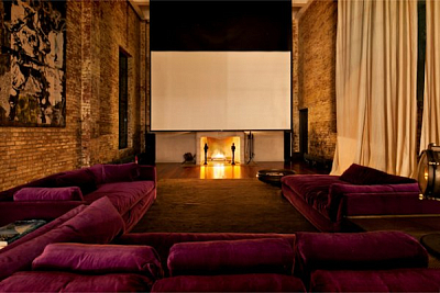 Впечатляет и зона отдыха. Пурпурные и фиолетовые тона прекрасно гармонируют с кирпичными стенами, а невероятно высокие шторы сочетаются с экраном для домашнего кинотеатра. Просто восхитительно!