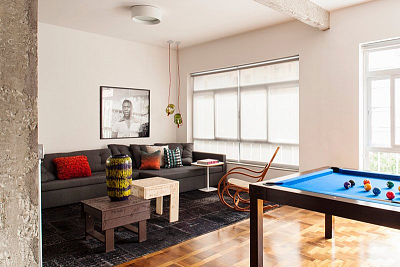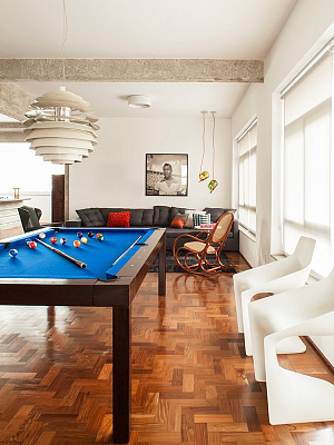 Делая ставку на универсальность мебели, бильярдный стол в середине комнаты превращается в обеденный стол. Мебель по эскизам Маурисио Арруда также является частью декора по просьбе владельцев.