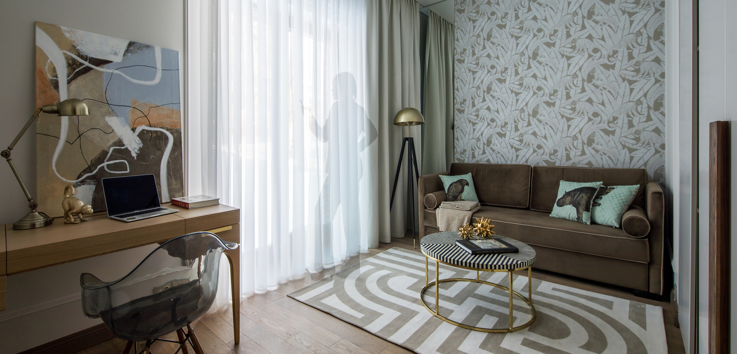 В этой квартире предусмотрен небольшой, но уютный кабинет. Здесь красивый деревянный пол светло-коричневого оттенка перекликается с диваном цвета кофе с молоком. За диваном Мария сделала акцентную стену: она украшена монохромными обоями в бежевых тонах с растительным орнаментом. Абажур торшера гармонирует с латунным подстольем журнального столика BONE INLAY Round, настольной лампой, декором и ручками стола. Некоторой строгости кабинету добавляет ковер с геометрическим рисунком. Чтобы освежить оформление, Мария использовала бирюзовые подушки с забавными животными. При желании эта комната может легко превратиться в детскую или в комнату подростка.