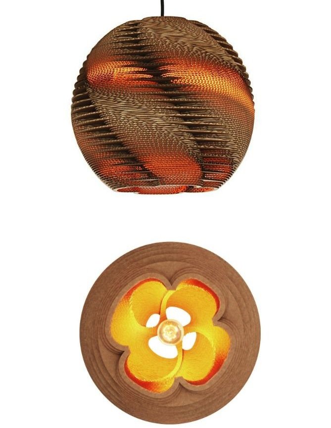Сама бумага заставляет вспомнить, что сделана из дерева, и невольно ассоциируется с теплом. Подвесные светильники с абажурами из гофрированного картона добавят интерьеру уюта. Их мягкий теплый свет можно использовать для создания приятной дружеской атмосферы в гостиной или на кухне. Светильники с ненавязчивым, но современным дизайном помогут правильно расставить акценты и, при необходимости, разделить комнату на функциональные зоны. Каждая модель имеет свою оригинальную форму, однако они хорошо сочетаются между собой, что позволяет создать уникальную композицию для конкретного интерьера.