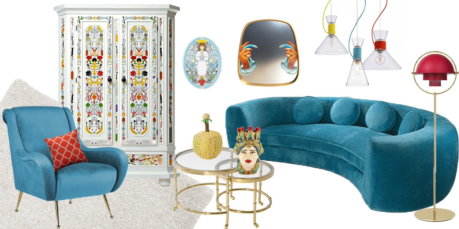 Сегодня мы хотим посвятить нашу подборку такому яркому и самобытному стилю в интерьере под названием китч. Главным акцентом интерьера у нас выступает стильный шкаф с причудливыми узорами, которые являются своеобразной интерпретацией средневекового стиля. Его прекрасно дополнят диван и кресло интересного цвета "морской волны", а также яркие небанальные светильники. Все это формирует причудливый цветовой ансамбль, в таком интерьере точно не заскучаешь! Респектабельности и солидности гостиной придают золотые элементы. Декор в этой подборке тоже смелый и нестандартный: cицилийская традиционная ваза Abhika в виде женской головы, зеркало с принтом Seletti и необычный экзотический фрукт.