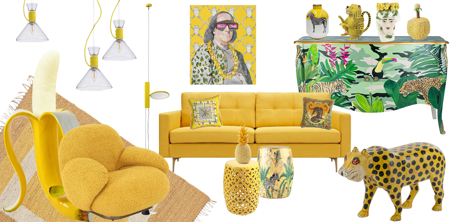 Яркий и жизнерадостный желтый цвет – самая логичная ассоциация с летом, поэтому на этой неделе наша подборка про него. Желтый наполняет пространство теплом, заряжает позитивными вибрациями и провоцирует улыбки на лицах. По этой причине мы выбрали китч, как ключевую стилистику подборки. Диван и кресло имеют разные формы, оттенки и фактуры. Забавный торшер в виде банана и настольная лампа-ананас поддерживает тропическую тему, заданную единственным контрастным предметом в этой обстановке, – расписанным вручную зеленым комодом. Леопарды с его фасадов повторяются в декоре – статуэтке, чайнике, подушке. Отдельно хочется обратить внимание на необычный портрет Бенджамина Франклина на фоне хоровода лягушек.